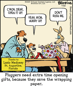 Today, "Plugger" means "Hoarder".That's all there is to it really. I know hoarders, and I know people who have a sense of drama when opening presents, and I know people who appreciate good giftwrapping (the operative word being "good") and like to be careful with it, and there is a little overlap between those things. But if you need more time than your average family member to open any presents for no reason other than because you just can't spoil that five cents per yard paper with pastel colored dots on, then you're a hoarder and you should listen to the warnings of your loved ones, even if they care about your feelings so much they can only speak those warnings with smiles on their faces.